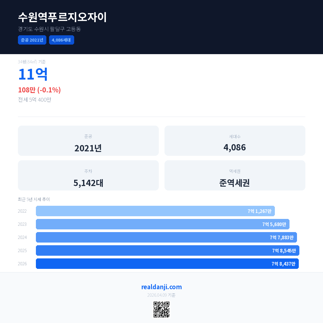 수원역푸르지오자이 최근 거래가는 11억입니다. (2026-04)