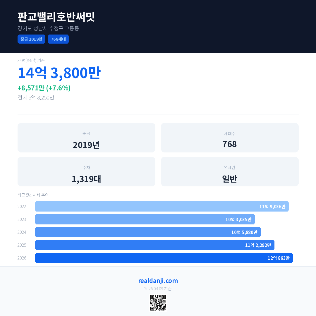 판교밸리호반써밋 국민평형 기준 2026년 평균 거래가는 12억 863만으로, 전년 대비 7.6% 상승 했습니다.