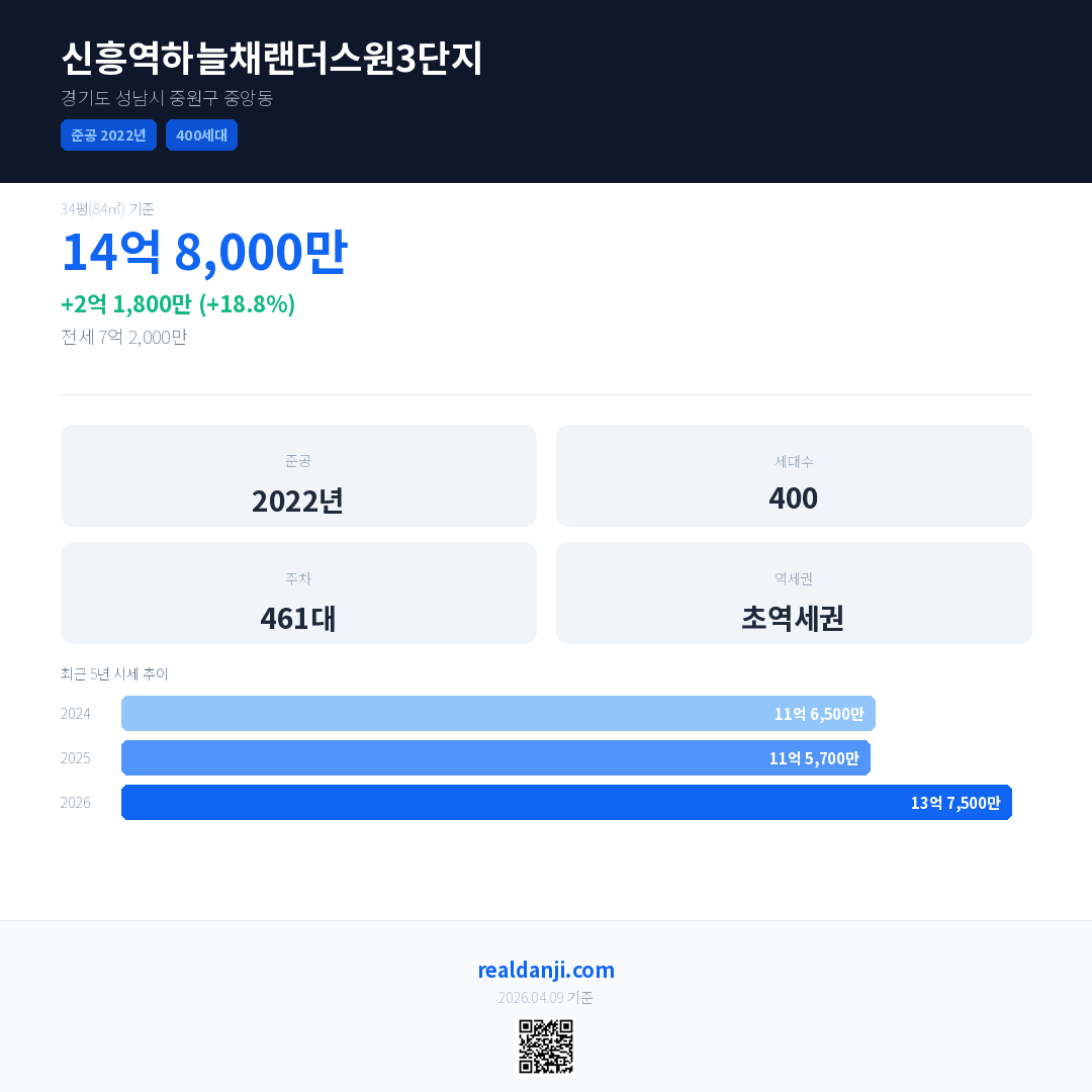 신흥역하늘채랜더스원3단지 국민평형 기준 2026년 평균 거래가는 13억 7,500만으로, 전년 대비 18.8% 상승 했습니다.
