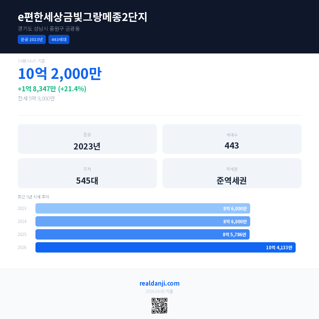 e편한세상금빛그랑메종2단지 국민평형 기준 2026년 평균 거래가는 10억 4,133만으로, 전년 대비 21.4% 상승 했습니다.