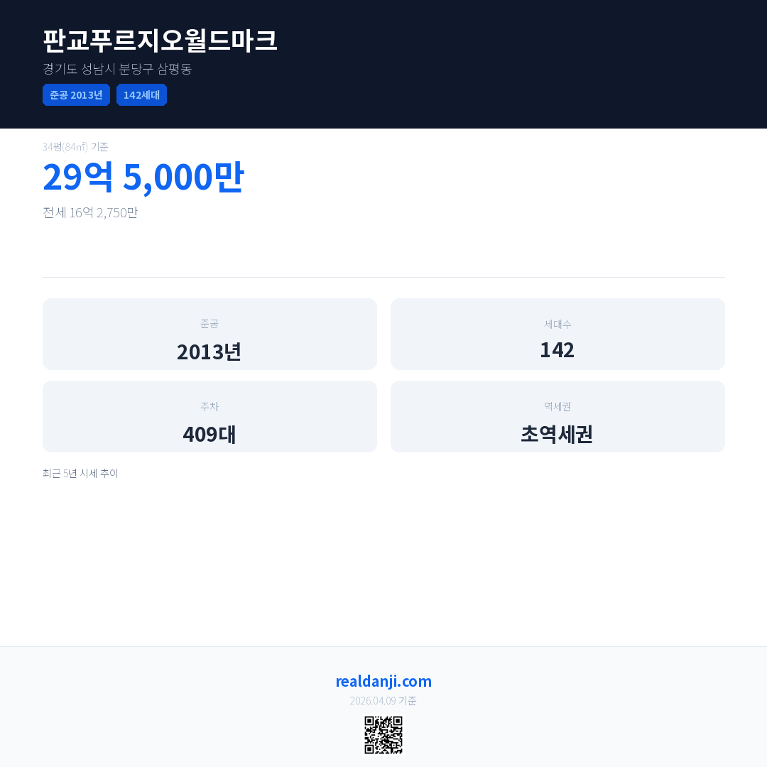 판교푸르지오월드마크 최근 거래가는 29억 5,000만입니다. (2025-12)