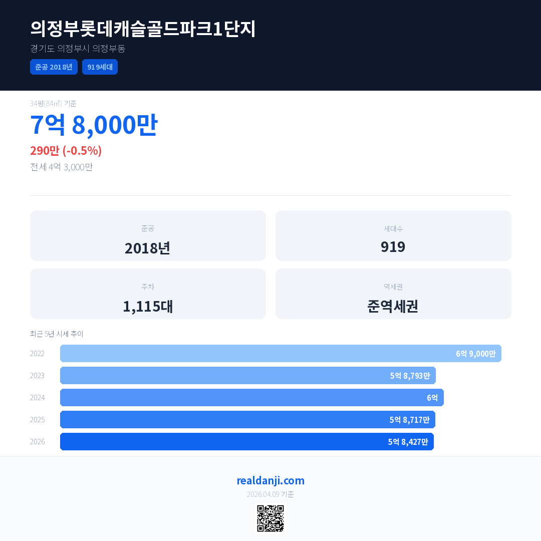 의정부롯데캐슬골드파크1단지 국민평형 기준 2026년 평균 거래가는 5억 8,427만으로, 전년 대비 0.5% 하락 했습니다.