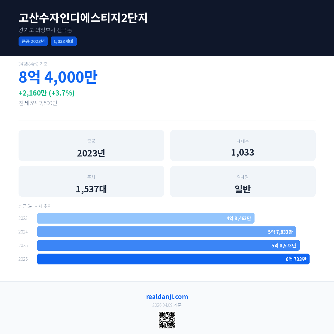 고산수자인디에스티지2단지 최근 거래가는 8억 4,000만입니다. (2026-04)