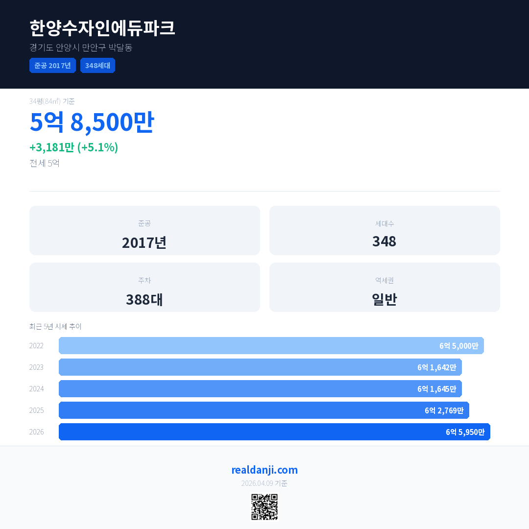 한양수자인에듀파크 국민평형 기준 2026년 평균 거래가는 6억 5,950만으로, 전년 대비 5.1% 상승 했습니다.