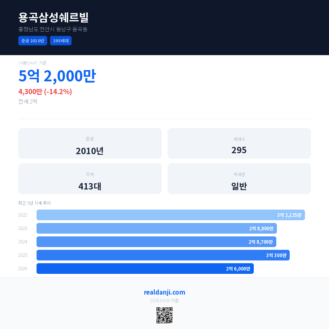 용곡삼성쉐르빌 국민평형 기준 2026년 평균 거래가는 2억 6,000만으로, 전년 대비 14.2% 하락 했습니다.