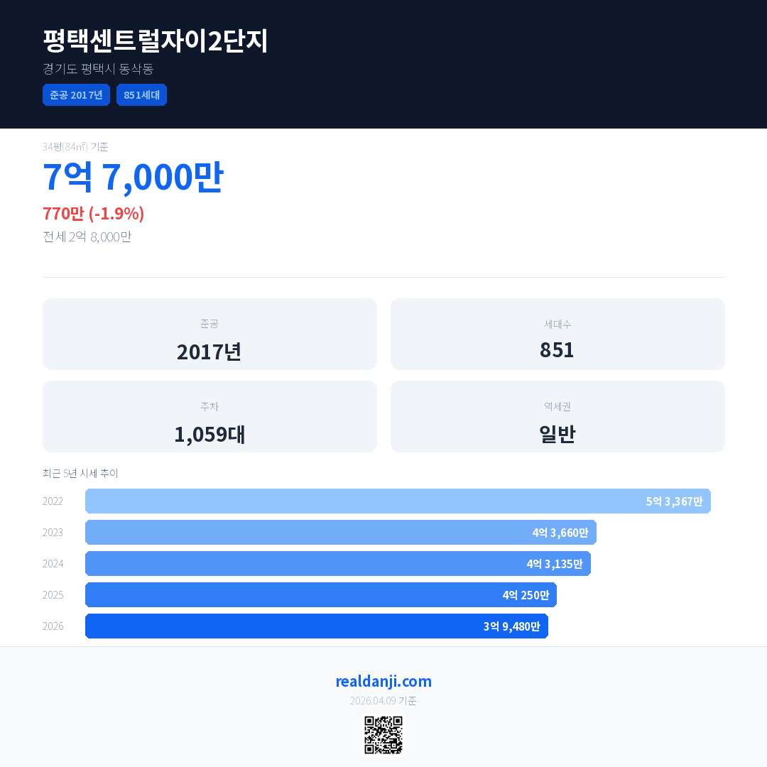 평택센트럴자이2단지 최근 거래가는 7억 7,000만입니다. (2026-03)