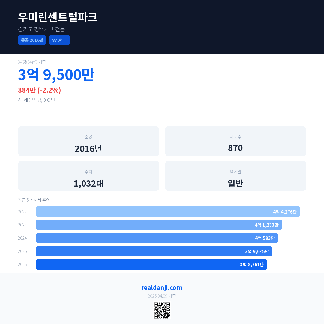우미린센트럴파크 국민평형 기준 2026년 평균 거래가는 3억 8,761만으로, 전년 대비 2.2% 하락 했습니다.