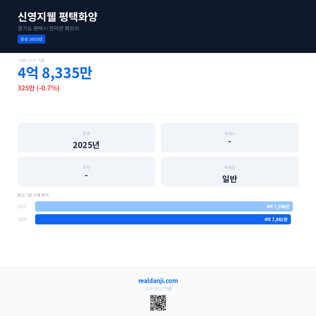 신영지웰 평택화양 최근 거래가는 4억 8,335만입니다. (2026-03)