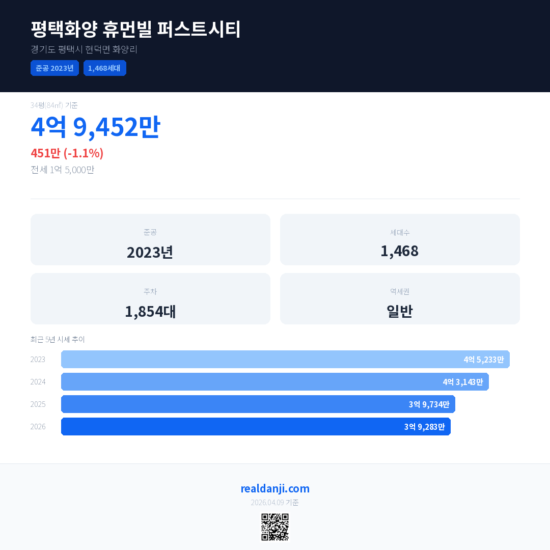 평택화양 휴먼빌 퍼스트시티 최근 거래가는 4억 9,452만입니다. (2026-03)
