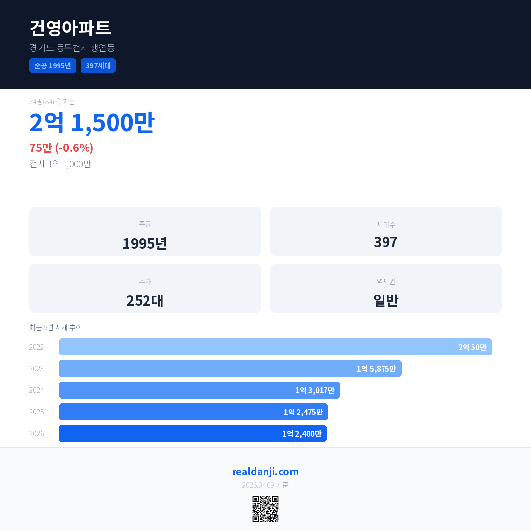 건영아파트 최근 거래가는 2억 1,500만입니다. (2026-03)