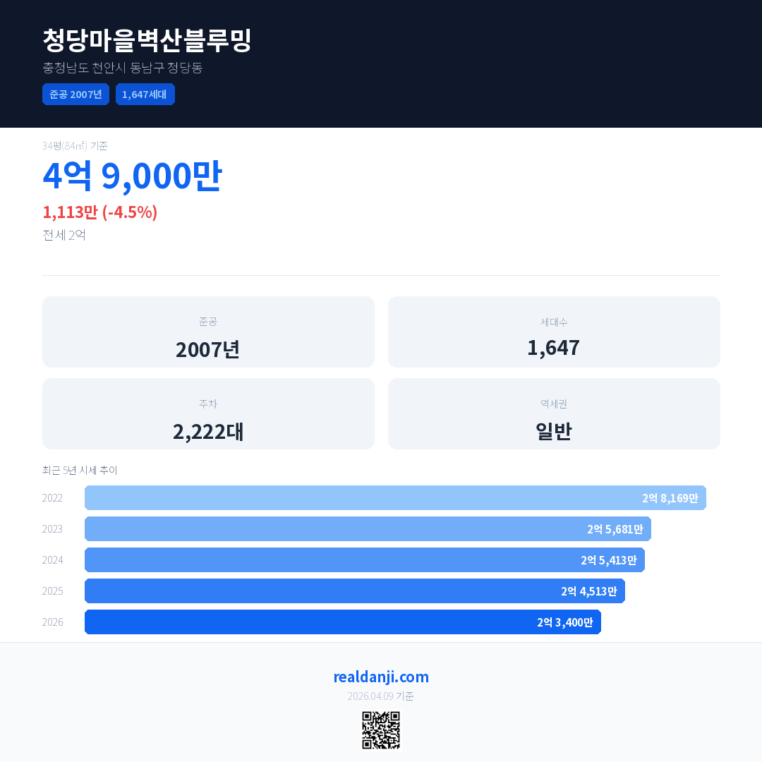 청당마을벽산블루밍 최근 거래가는 4억 9,000만입니다. (2026-04)