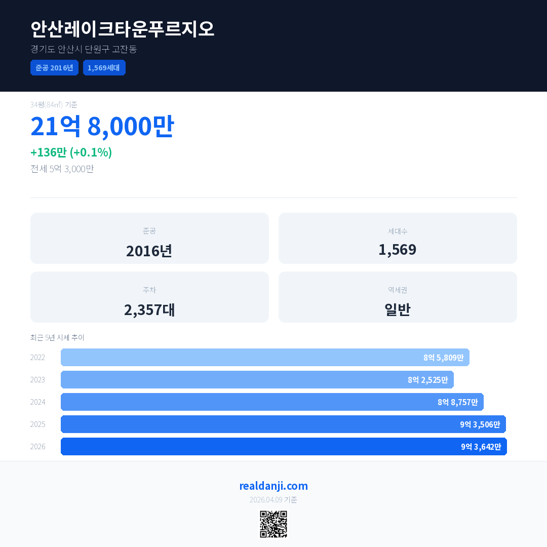 안산레이크타운푸르지오 국민평형 기준 2026년 평균 거래가는 9억 3,642만으로, 전년 대비 0.1% 상승 했습니다.
