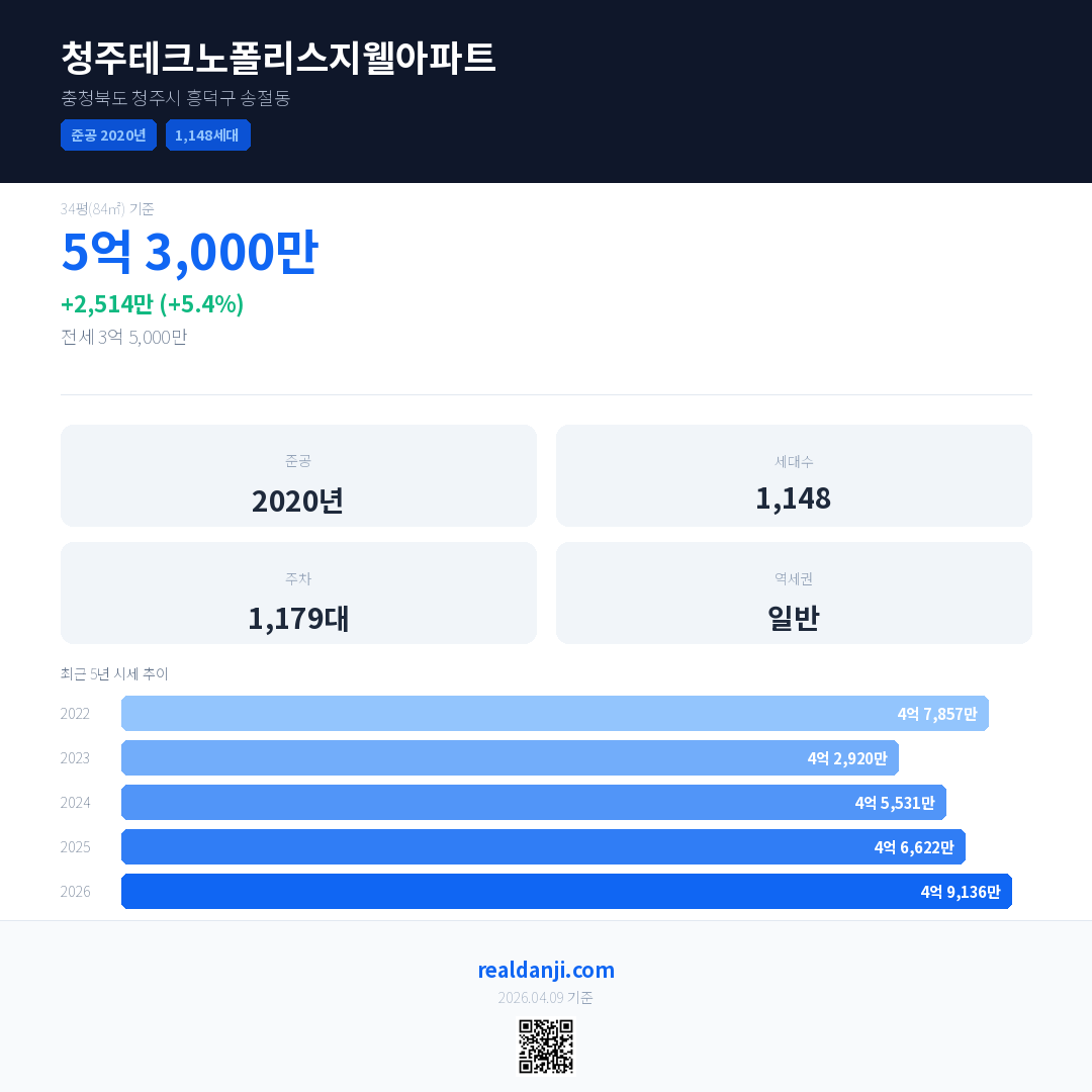청주테크노폴리스지웰아파트 국민평형 기준 2026년 평균 거래가는 4억 9,136만으로, 전년 대비 5.4% 상승 했습니다.
