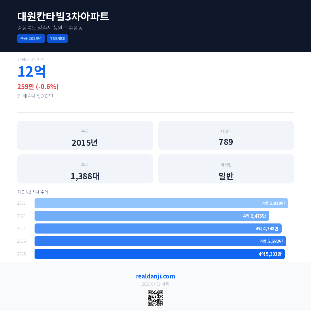 대원칸타빌3차아파트 국민평형 기준 2026년 평균 거래가는 4억 5,333만으로, 전년 대비 0.6% 하락 했습니다.