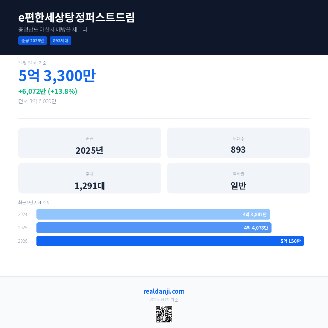 e편한세상탕정퍼스트드림은(는) 2025년에 준공되었으며, 현재 1년차입니다. 총 893세대 규모입니다.