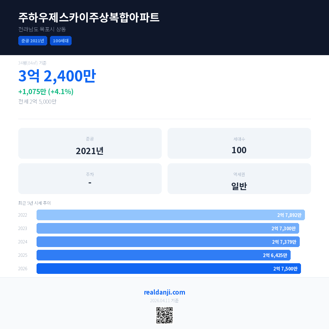 주하우제스카이주상복합아파트 국민평형 기준 2026년 평균 거래가는 2억 7,500만으로, 전년 대비 4.1% 상승 했습니다.