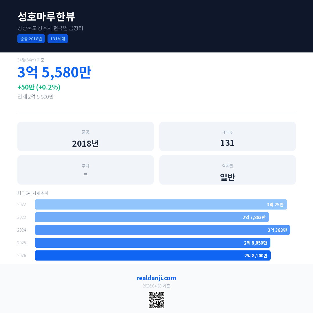 성호마루한뷰 최근 거래가는 3억 5,580만입니다. (2026-03)