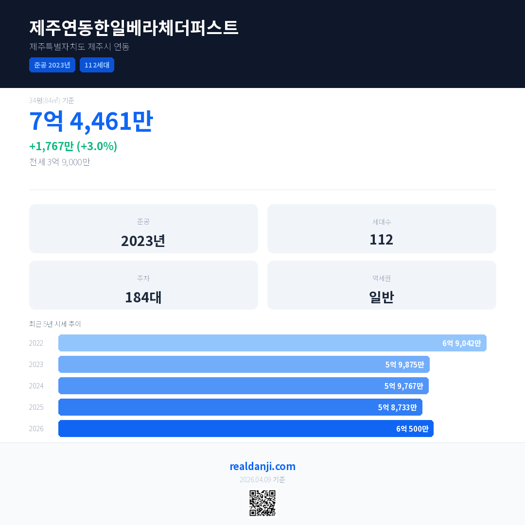 제주연동한일베라체더퍼스트 국민평형 기준 2026년 평균 거래가는 6억 500만으로, 전년 대비 3.0% 상승 했습니다.