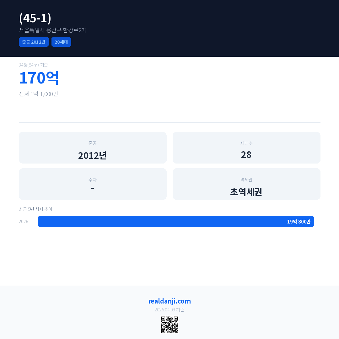 (45-1)은(는) 2012년에 준공되었으며, 현재 14년차입니다. 총 28세대 규모입니다.