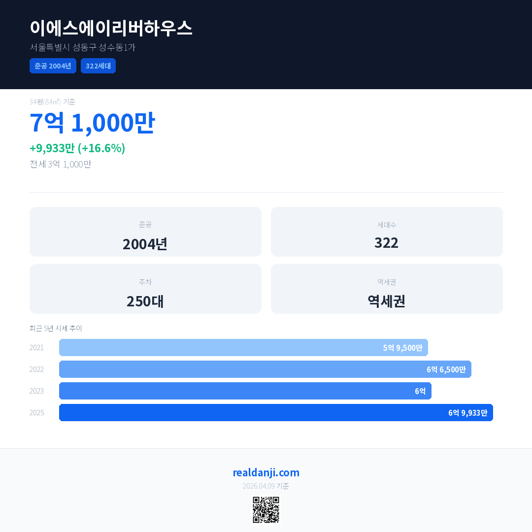 이에스에이리버하우스 국민평형 기준 2025년 평균 거래가는 6억 9,933만으로, 전년 대비 16.6% 상승 했습니다.
