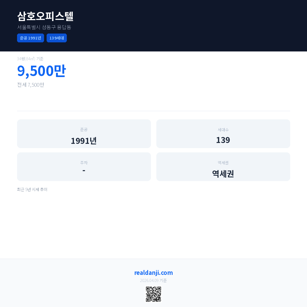 삼호오피스텔은(는) 1991년에 준공되었으며, 현재 35년차입니다. 총 139세대 규모입니다.
