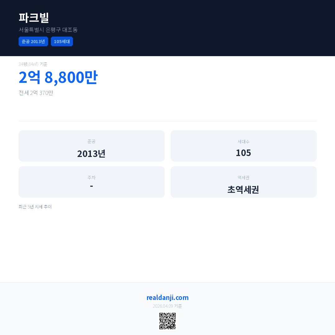 파크빌은(는) 2013년에 준공되었으며, 현재 13년차입니다. 총 105세대 규모입니다.