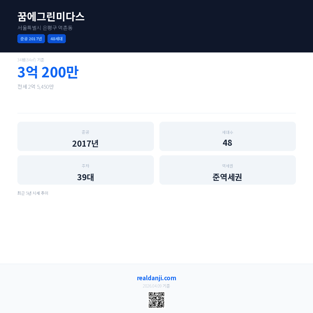 꿈에그린미다스은(는) 2017년에 준공되었으며, 현재 9년차입니다. 총 48세대 규모입니다.