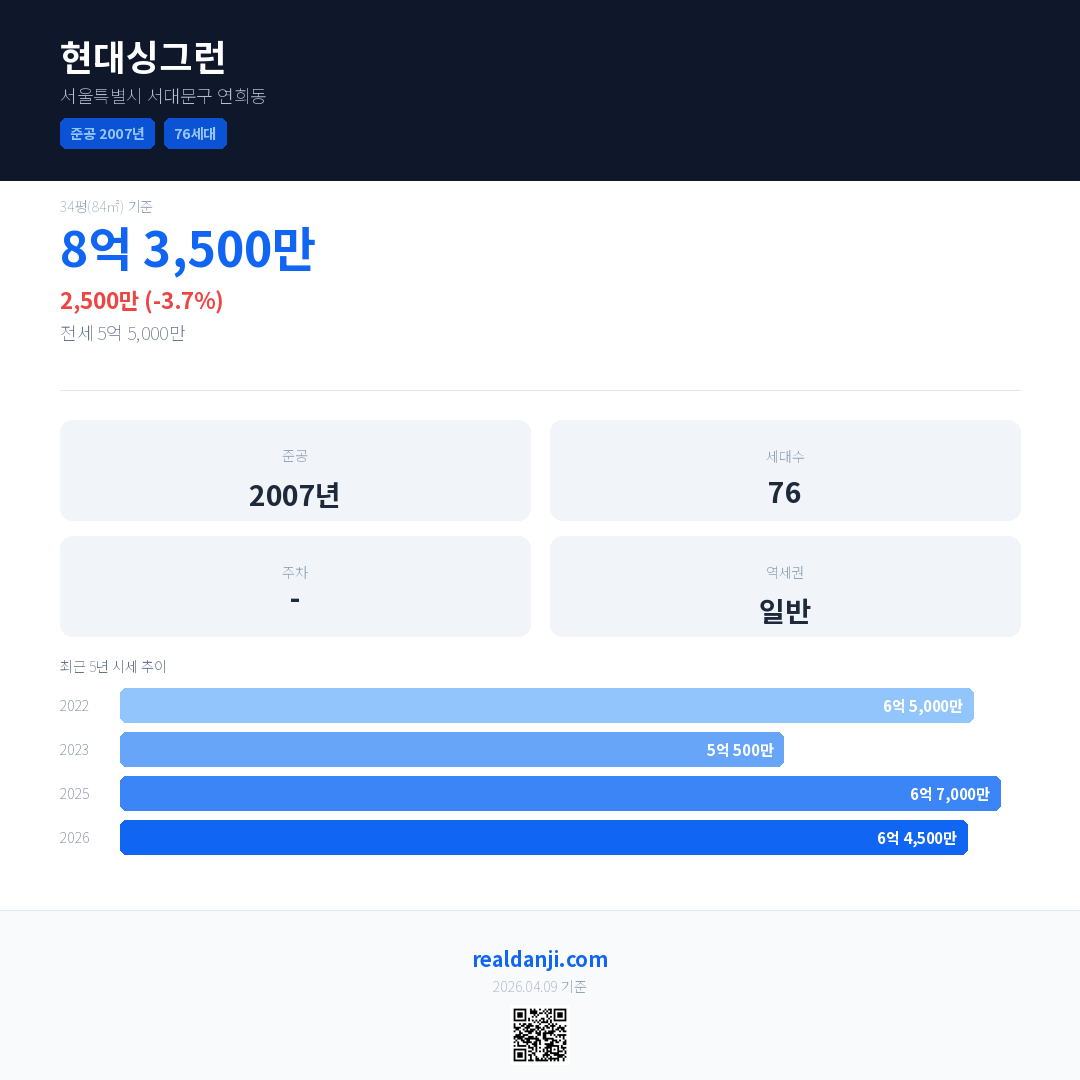 현대싱그런 최근 거래가는 8억 3,500만입니다. (2026-02)