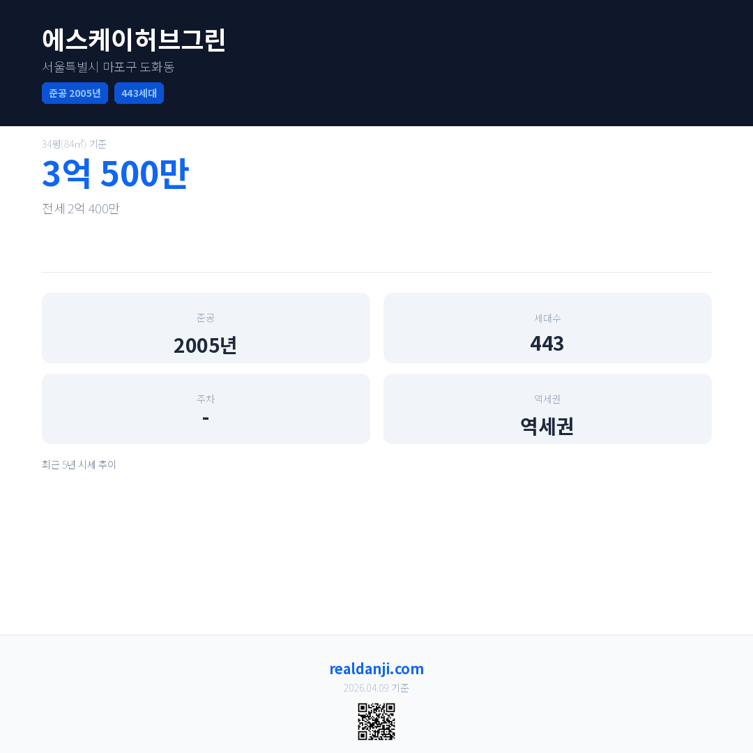 에스케이허브그린은(는) 2005년에 준공되었으며, 현재 21년차입니다. 총 443세대 규모입니다.