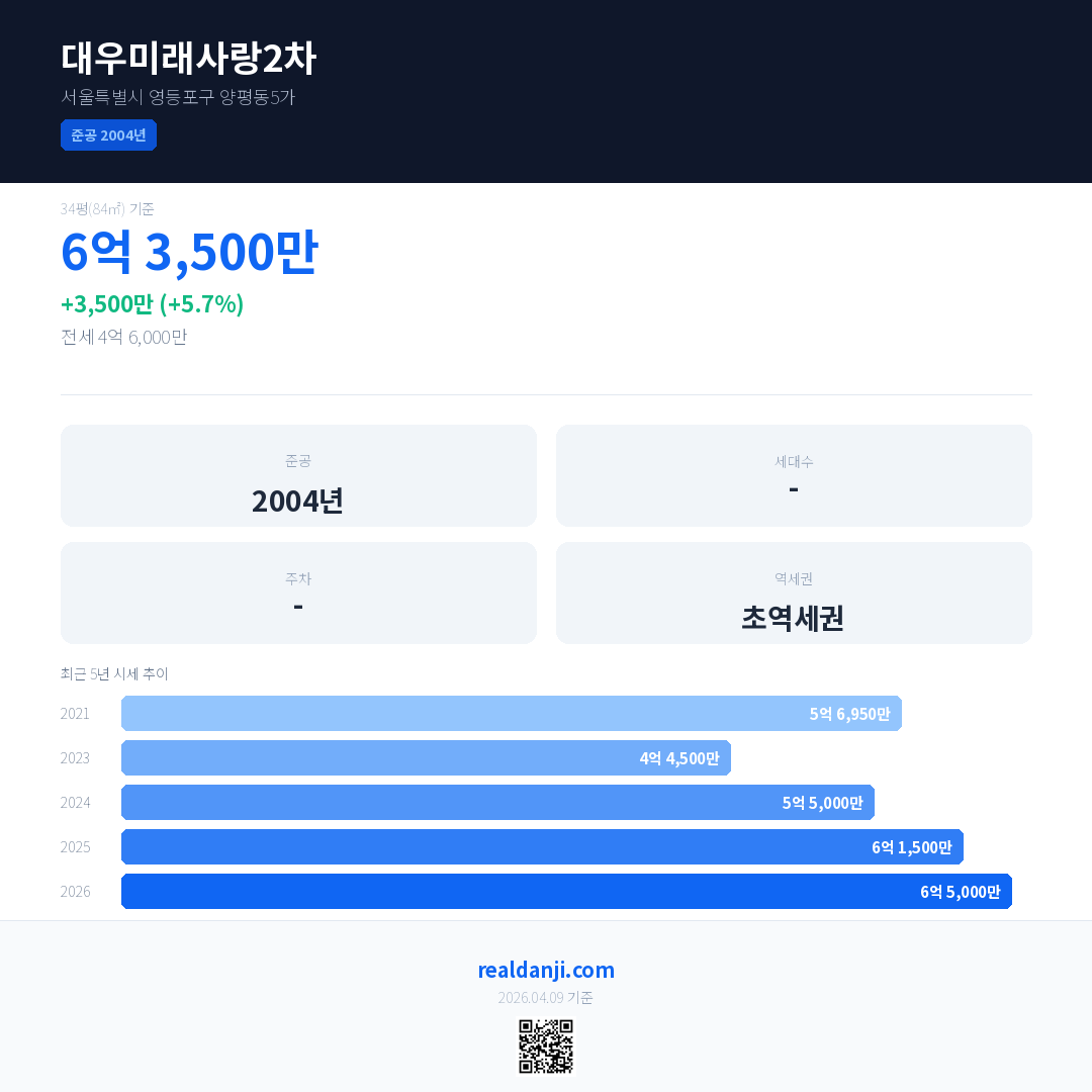 대우미래사랑2차 국민평형 기준 2026년 평균 거래가는 6억 5,000만으로, 전년 대비 5.7% 상승 했습니다.