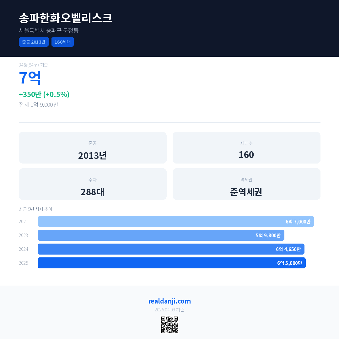 송파한화오벨리스크 국민평형 기준 2025년 평균 거래가는 6억 5,000만으로, 전년 대비 0.5% 상승 했습니다.