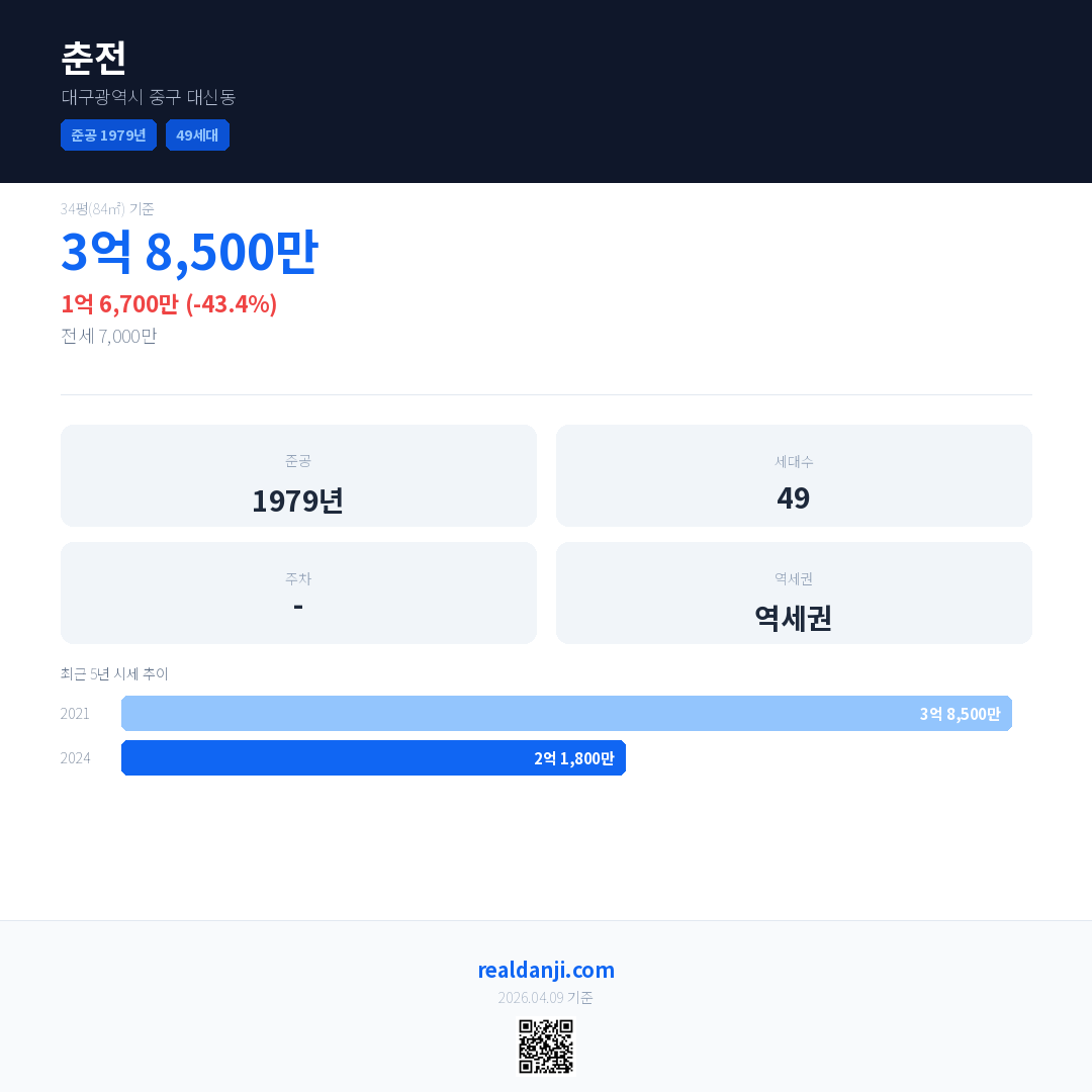 춘전 국민평형 기준 2024년 평균 거래가는 2억 1,800만으로, 전년 대비 43.4% 하락 했습니다.