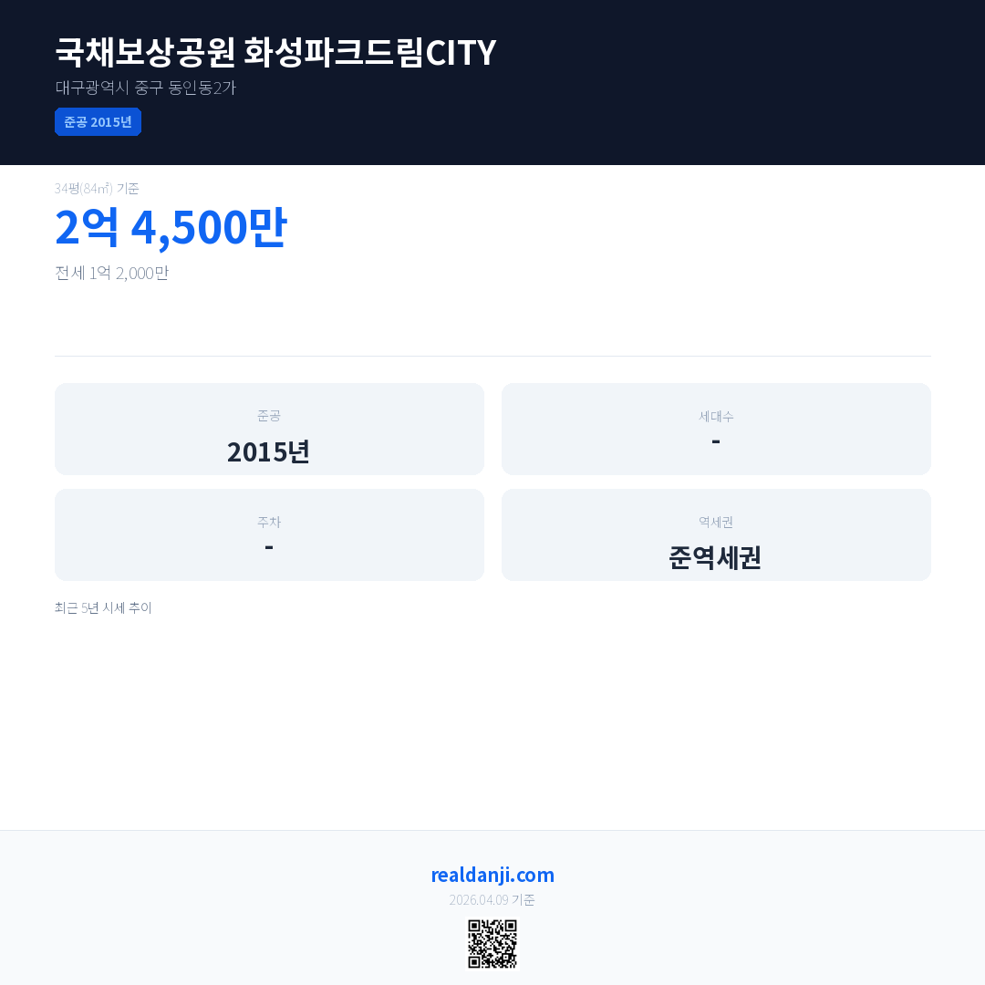 국채보상공원 화성파크드림CITY 최근 거래가는 2억 4,500만입니다. (2026-04)