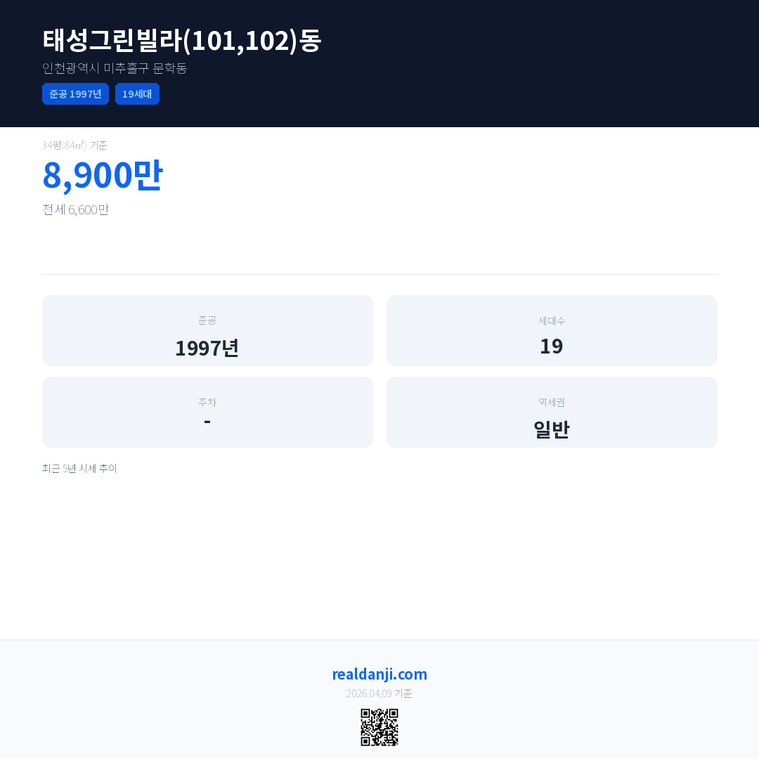 태성그린빌라(101,102)동은(는) 1997년에 준공되었으며, 현재 29년차입니다. 총 19세대 규모입니다.