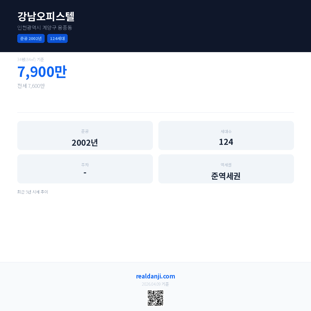 강남오피스텔은(는) 2002년에 준공되었으며, 현재 24년차입니다. 총 124세대 규모입니다.