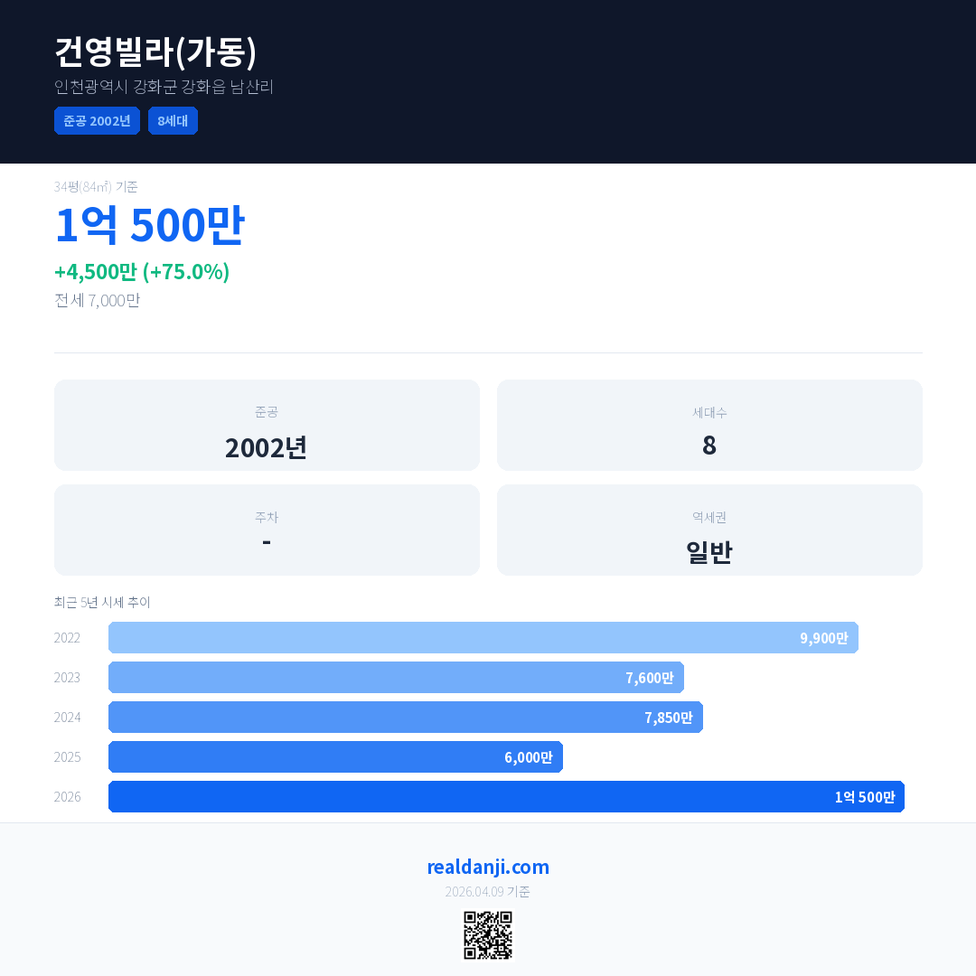 건영빌라(가동)은(는) 2002년에 준공되었으며, 현재 24년차입니다. 총 8세대 규모입니다.