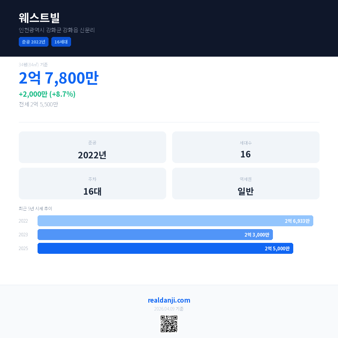 웨스트빌 국민평형 기준 2025년 평균 거래가는 2억 5,000만으로, 전년 대비 8.7% 상승 했습니다.