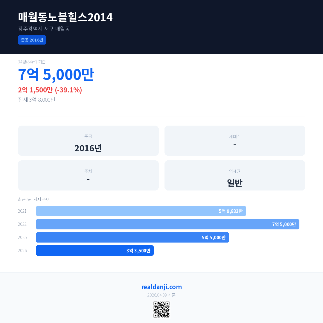 매월동노블힐스2014 국민평형 기준 2026년 평균 거래가는 3억 3,500만으로, 전년 대비 39.1% 하락 했습니다.