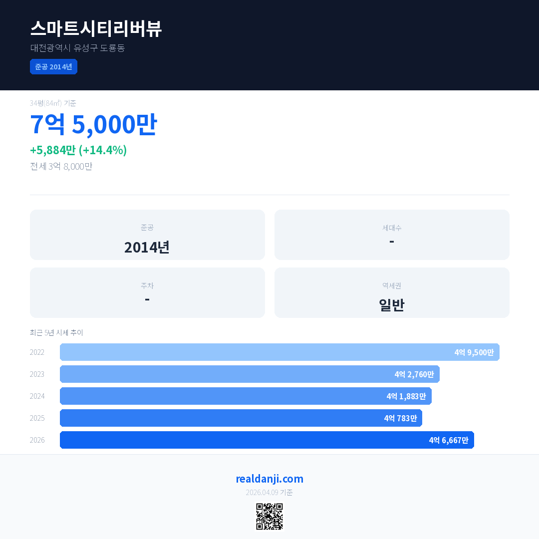 스마트시티리버뷰 국민평형 기준 2026년 평균 거래가는 4억 6,667만으로, 전년 대비 14.4% 상승 했습니다.