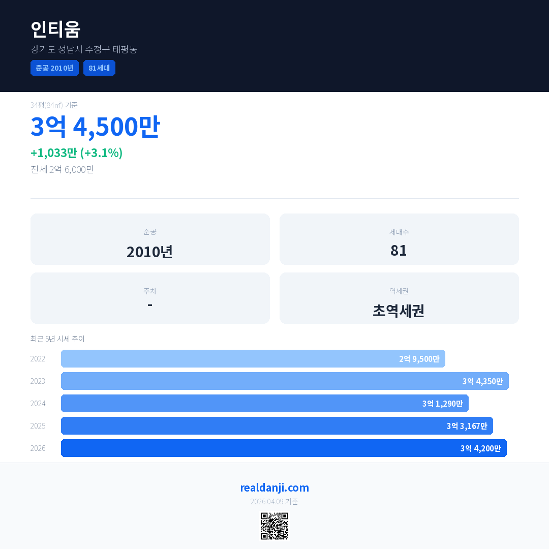 인티움 국민평형 기준 2026년 평균 거래가는 3억 4,200만으로, 전년 대비 3.1% 상승 했습니다.