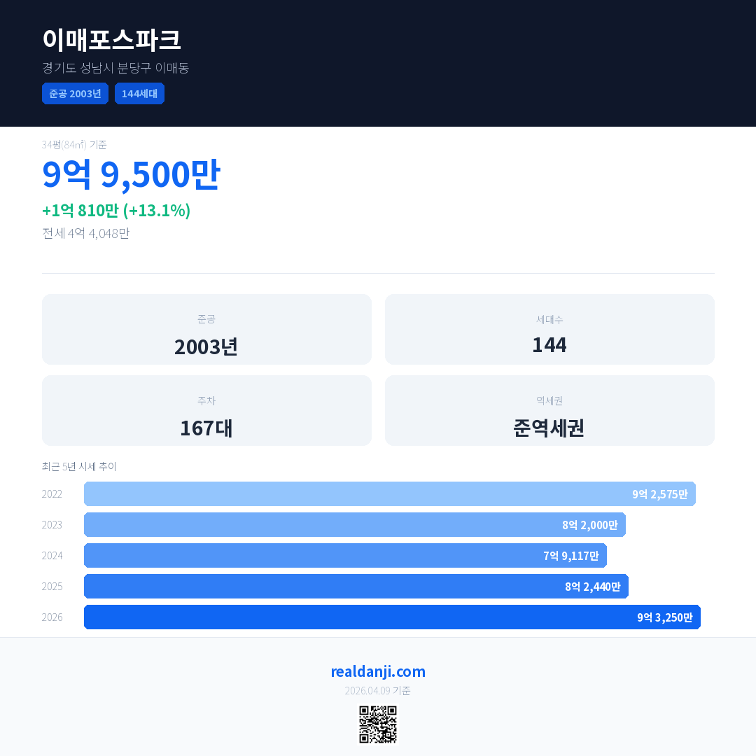 이매포스파크 최근 거래가는 9억 9,500만입니다. (2026-03)