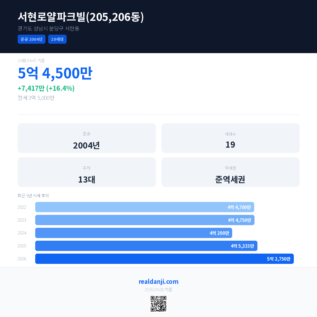 서현로얄파크빌(205,206동) 최근 거래가는 5억 4,500만입니다. (2026-01)