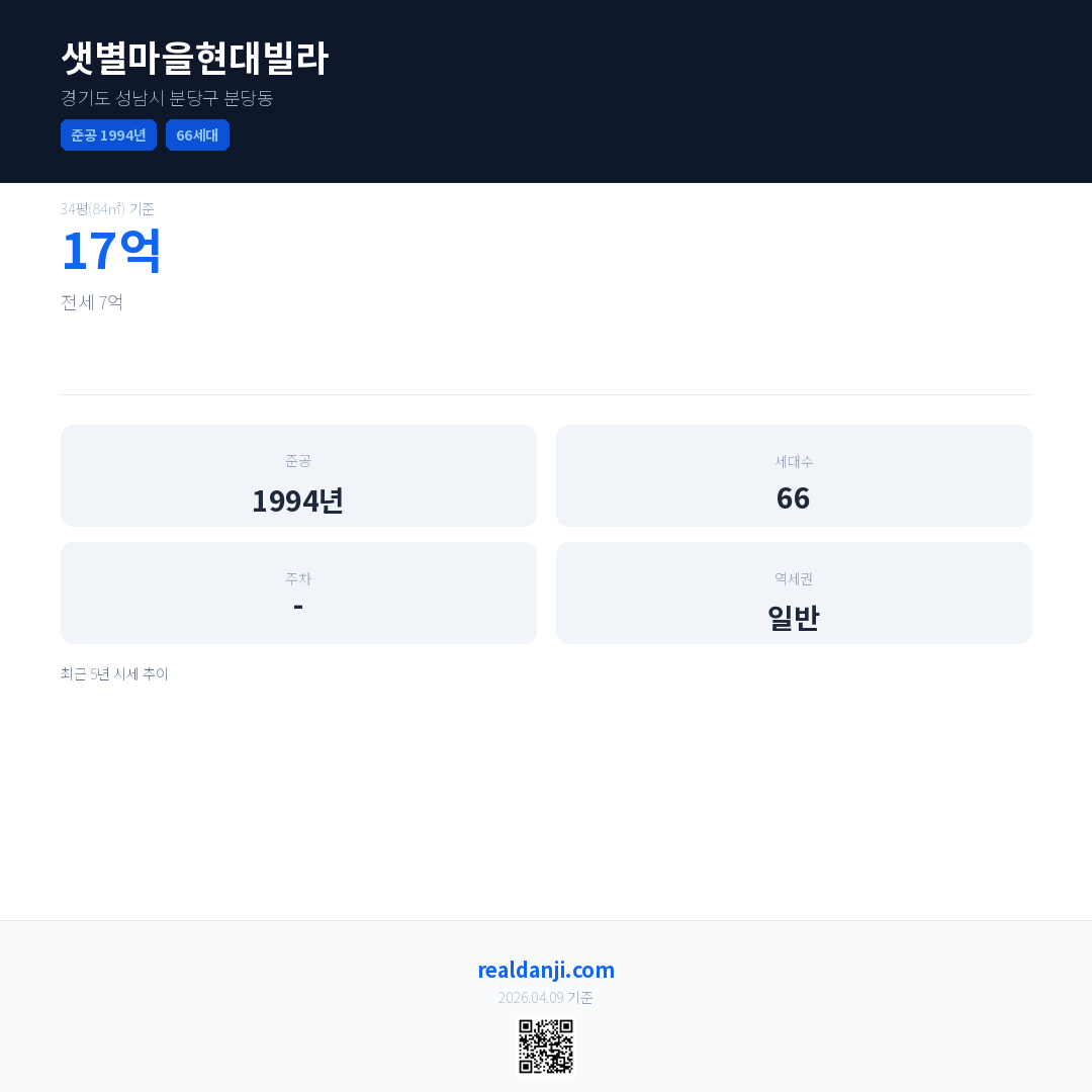 샛별마을현대빌라 최근 거래가는 17억입니다. (2025-09)