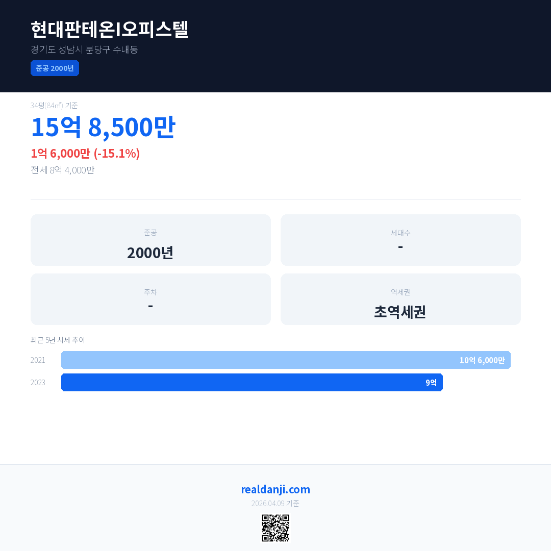 현대판테온I오피스텔 최근 거래가는 15억 8,500만입니다. (2026-03)