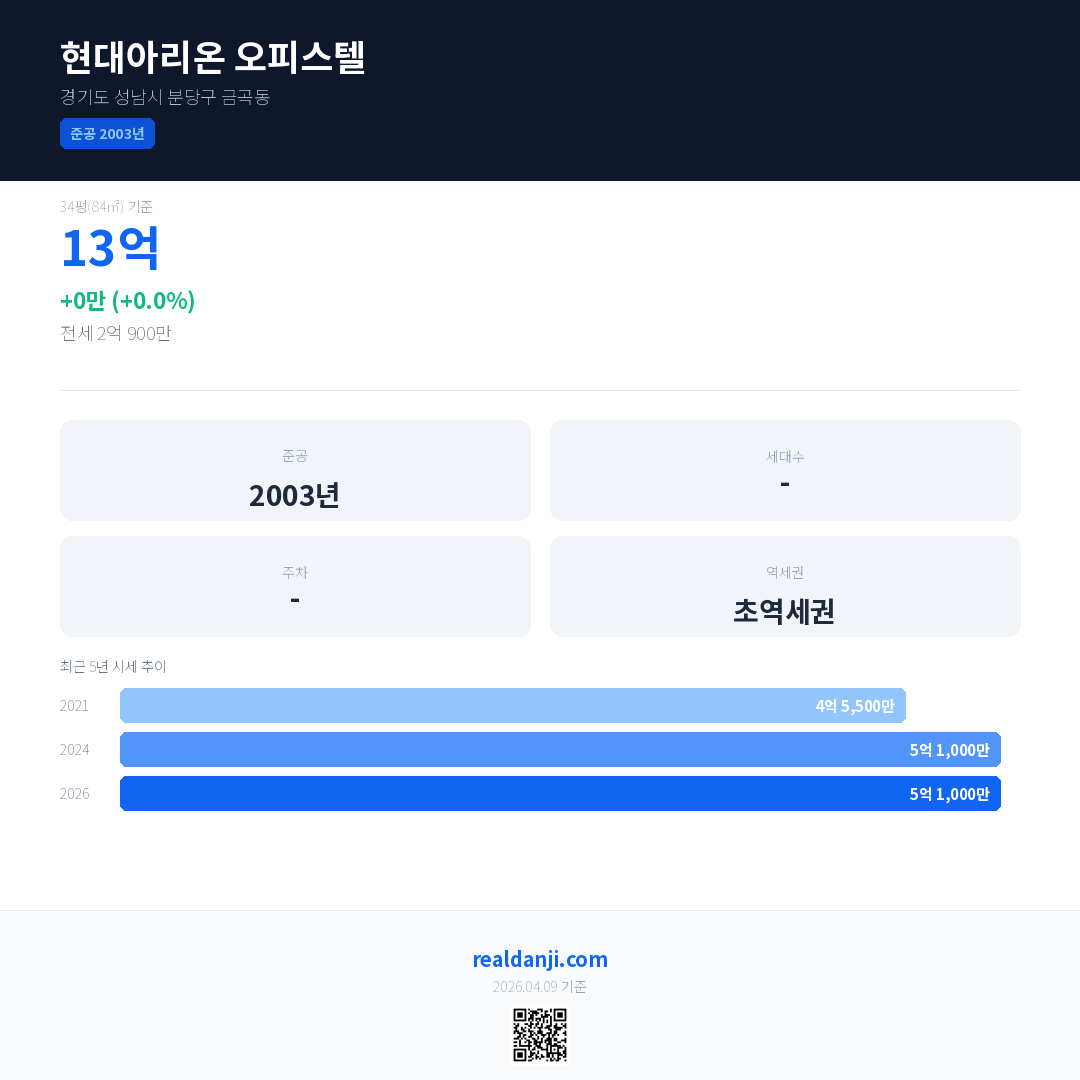현대아리온 오피스텔 최근 거래가는 13억입니다. (2026-03)