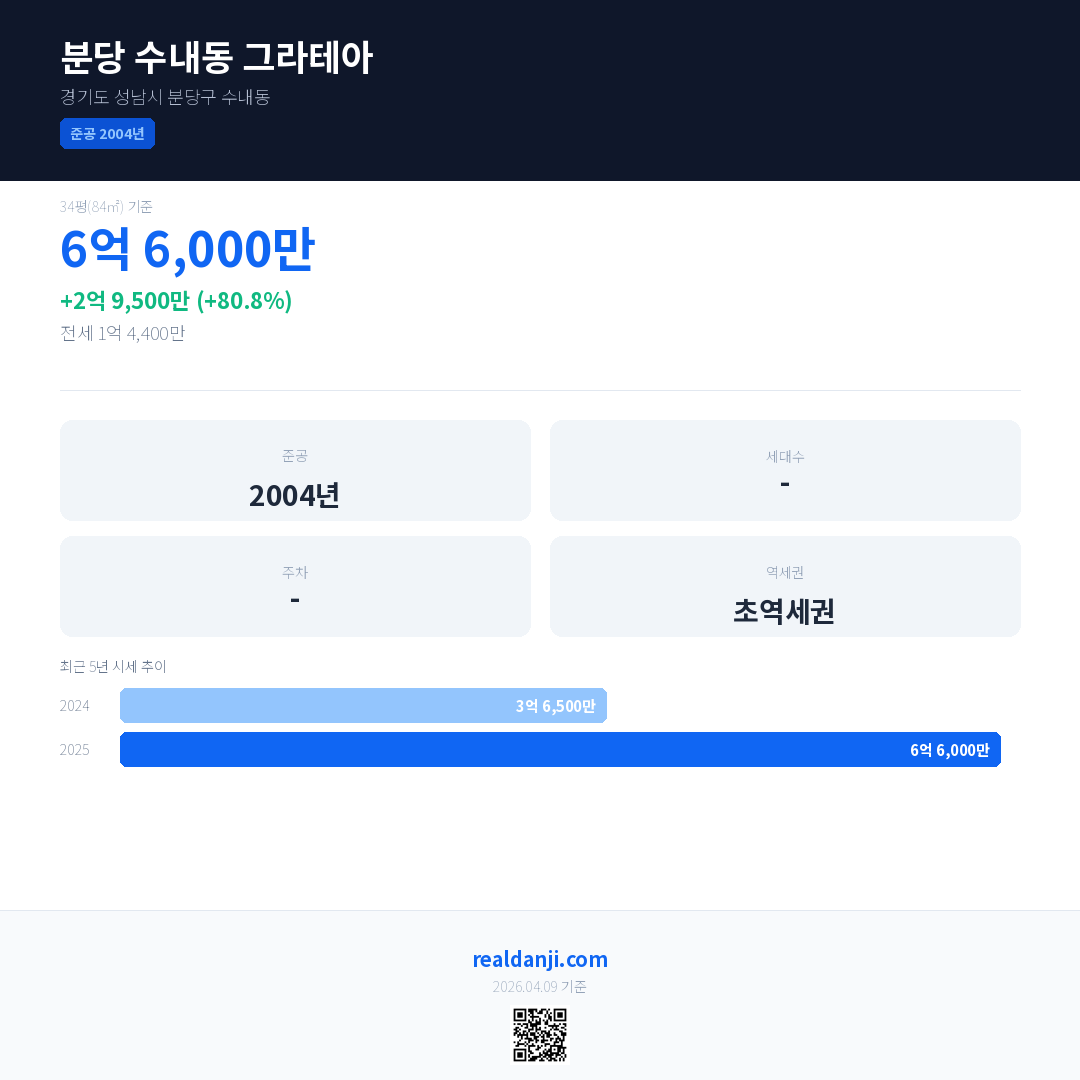 분당 수내동 그라테아 국민평형 기준 2025년 평균 거래가는 6억 6,000만으로, 전년 대비 80.8% 상승 했습니다.