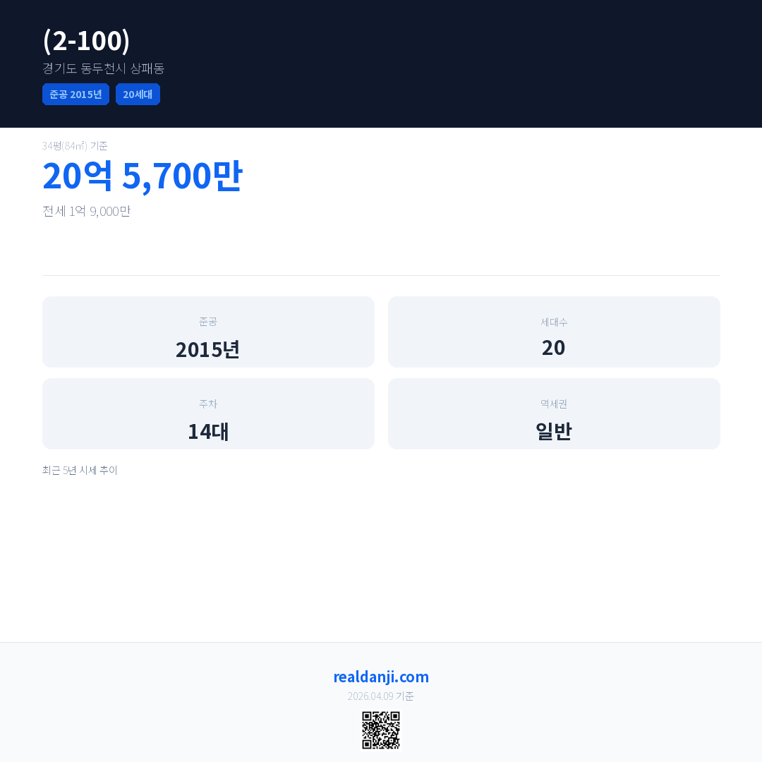 (2-100)은(는) 2015년에 준공되었으며, 현재 11년차입니다. 총 20세대 규모입니다.