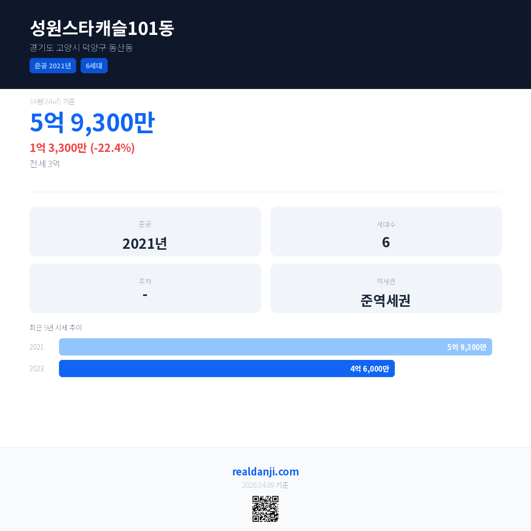 성원스타캐슬101동 최근 거래가는 5억 9,300만입니다. (2023-09)