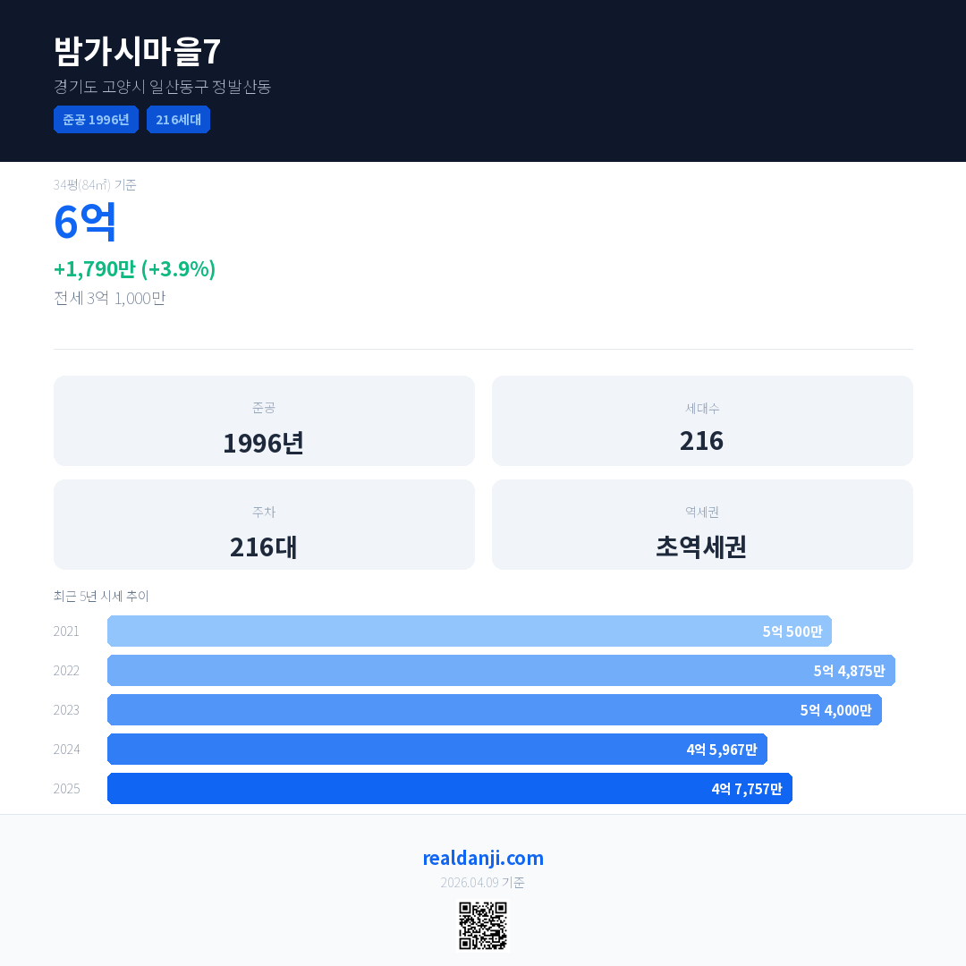 밤가시마을7 국민평형 기준 2025년 평균 거래가는 4억 7,757만으로, 전년 대비 3.9% 상승 했습니다.