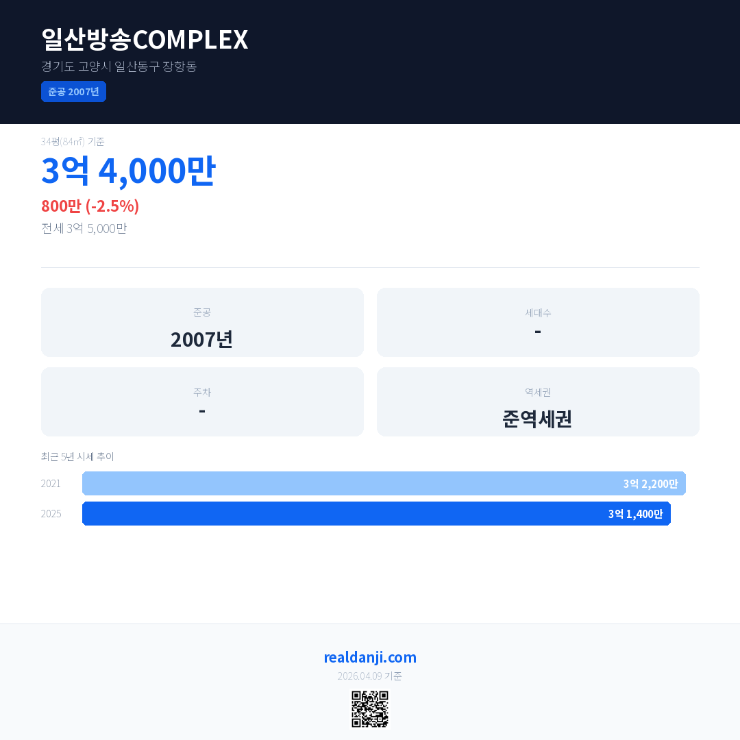 일산방송COMPLEX 국민평형 기준 2025년 평균 거래가는 3억 1,400만으로, 전년 대비 2.5% 하락 했습니다.